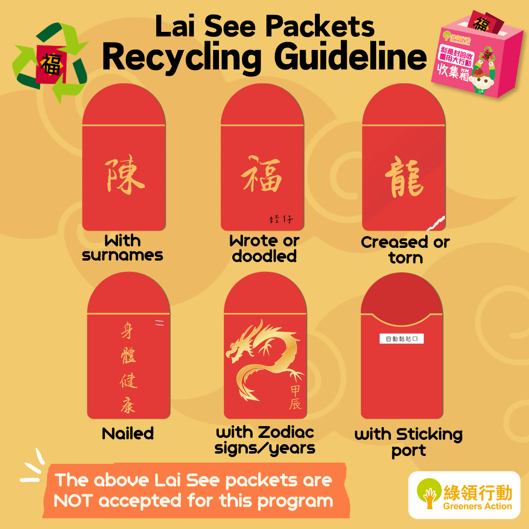 Greeners Action's signature program “Lai See Reuse and Recycle Program 2024”lai see packets collection period is officially started. From 19 Feb to 17 Mar, over 400 public collection points are open for public.