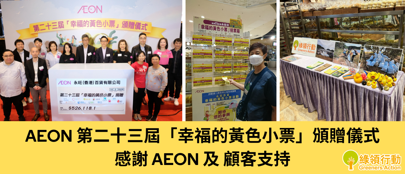 綠領行動有幸於2023年8月至2024年1月期間,參與AEON第23屆「幸福的黃色小票」活動。顧客在每月的11日購物後,會額外收到一張印有消費總額的黃色收據,並可將收據投入所支持團體的投放箱內。AEON便會根據小票總金額的1%,以物資捐贈形式支持本會。本會代表於3月16日到 AEON STYLE 康怡出席支票頒贈接受儀式。