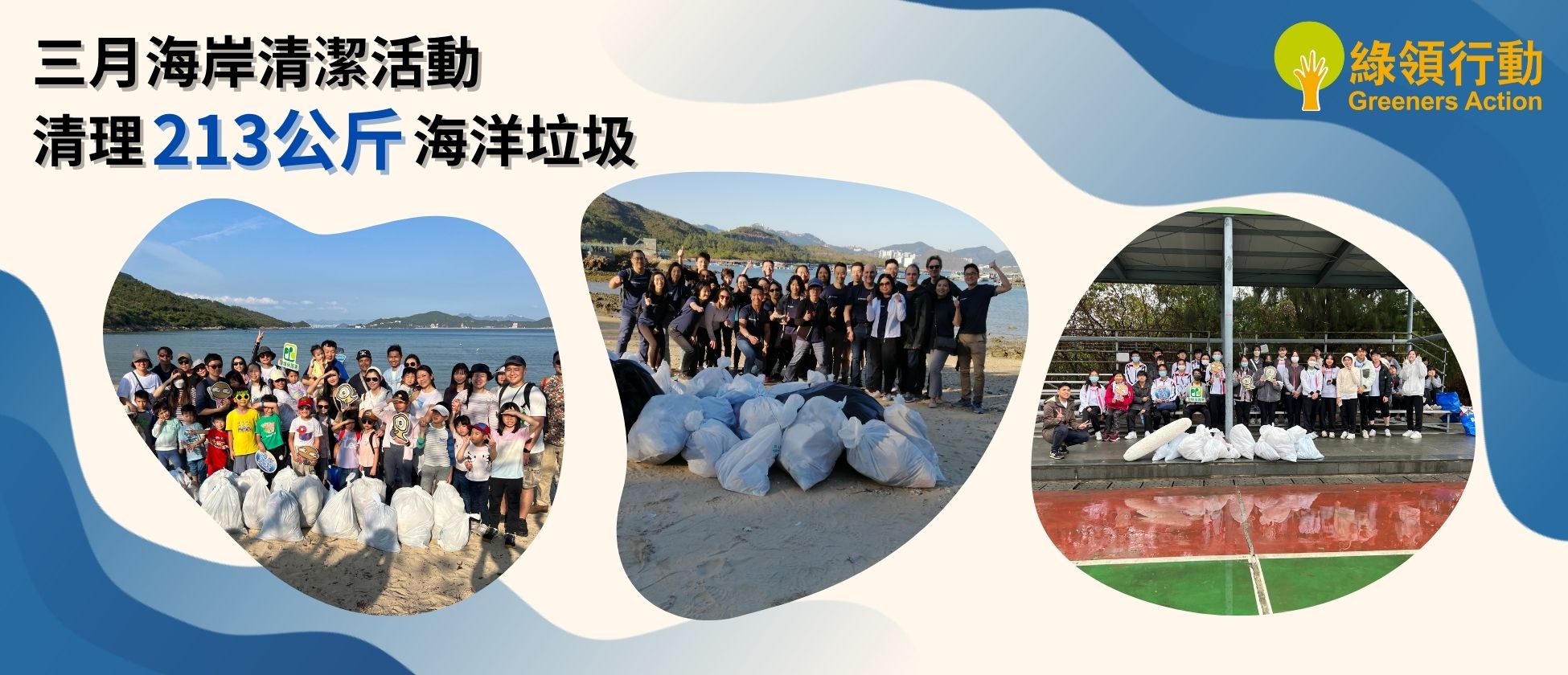 綠領行動在三月份聯同迦密愛禮信中學、聖公會聖基道兒童院、摩根大通、小玩伴一同合辦了四場海岸清潔活動,除了在大嶼山、烏溪沙淨灘之外,更遠道到南丫島索罟灣清潔垃圾,總共清理213公斤的垃圾。綠領行動在四月份亦展開新一期海岸清潔日的淨灘活動。