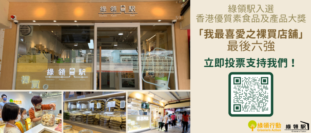 本會一直積極推廣裸買,減少過度包裝問題對環境的影響。本會旗下裸買店「綠領駅」(Greeners Fusion) 有幸入選香港優質素食品及產品大獎 (HKQVA) 之「我最喜愛之本地裸買店」組別中最後6強。本會現誠意邀請大家踴躍投票,投選「綠領駅」為「我最喜愛之本地裸買店」(組別五)。每位投票者只限投票一次,成功投票者可獲得環保餐具一套!