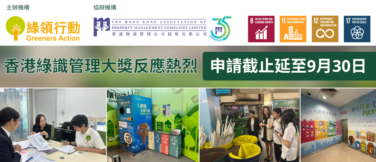 本年度「香港綠識管理大獎」由香港物業管理公司協會協辦,誠蒙各大物業管理公司支持,本會已收到大量申請,近日團隊更已到訪部分物業進行實地評估。為方便更多業界準備申請,我們決定將報名截止日期延長至9月30日。