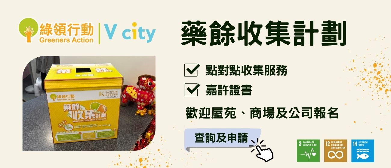 屯門V City將於今年2月開始,進行為期兩個月的藥餘收集計劃,回收箱設於客戶服務處,協助市民妥善回收家中過期或不再使用的藥物,避免藥餘進入本地生態系統,減低細菌抗藥性的風險。