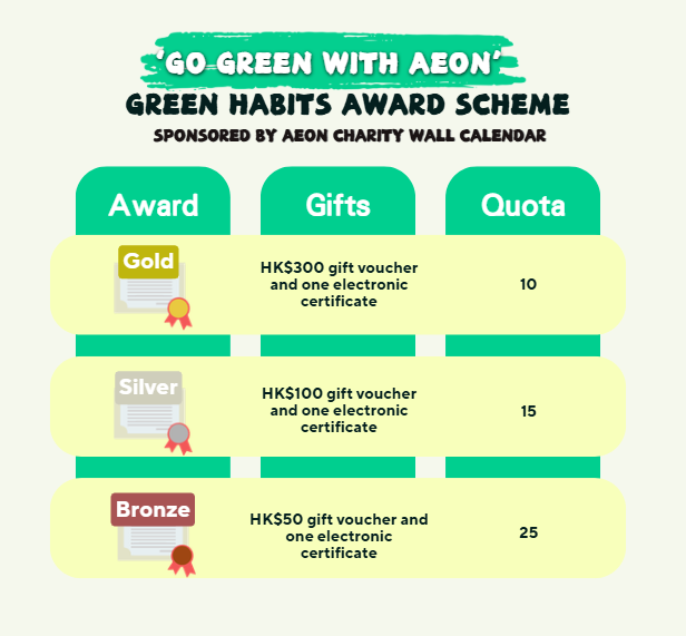Organized by Greeners Action and sponsored by AEON Stores (Hong Kong) Co., Limited, the **Go Green with AEON’ Green Habits Award Scheme** has officially commenced today!