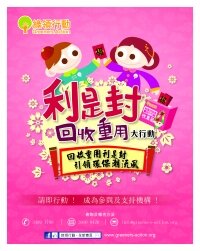 每年農曆新年,傳統習俗均會「派利是」,但香港人每年使用3.2億個利是封,相當於砍伐16,300棵樹。「利是封回收重用大行動」讓大家過節之餘,亦不忘保護環境。綠領行動會把收集所得的利是封經社福機構的工場篩選處理變成「新生利是封」,並供市民領取。